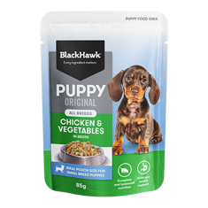 Black Hawk Puppy Chicken & Vegetables in Broth is formulated to meet the nutritional levels established by the Association of American Feed Control Officials (AAFCO) Dog Food Nutrient Profiles for growth including growth of large size dogs (30kg or more as an adult).